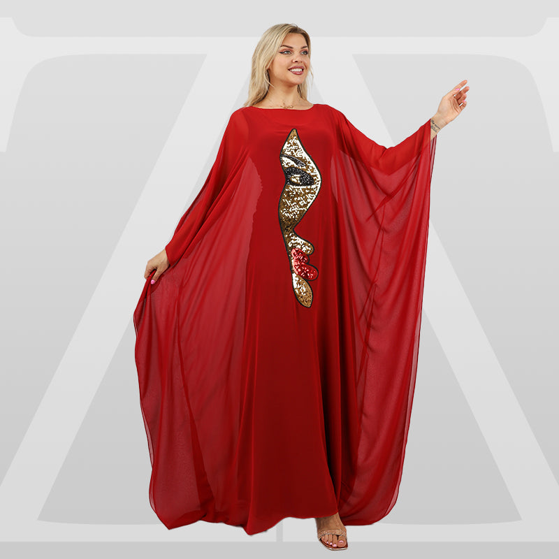 Jalabiya chiffon without lining withembroidery appliqués and sequin free size, fits 70kg to 130kg