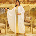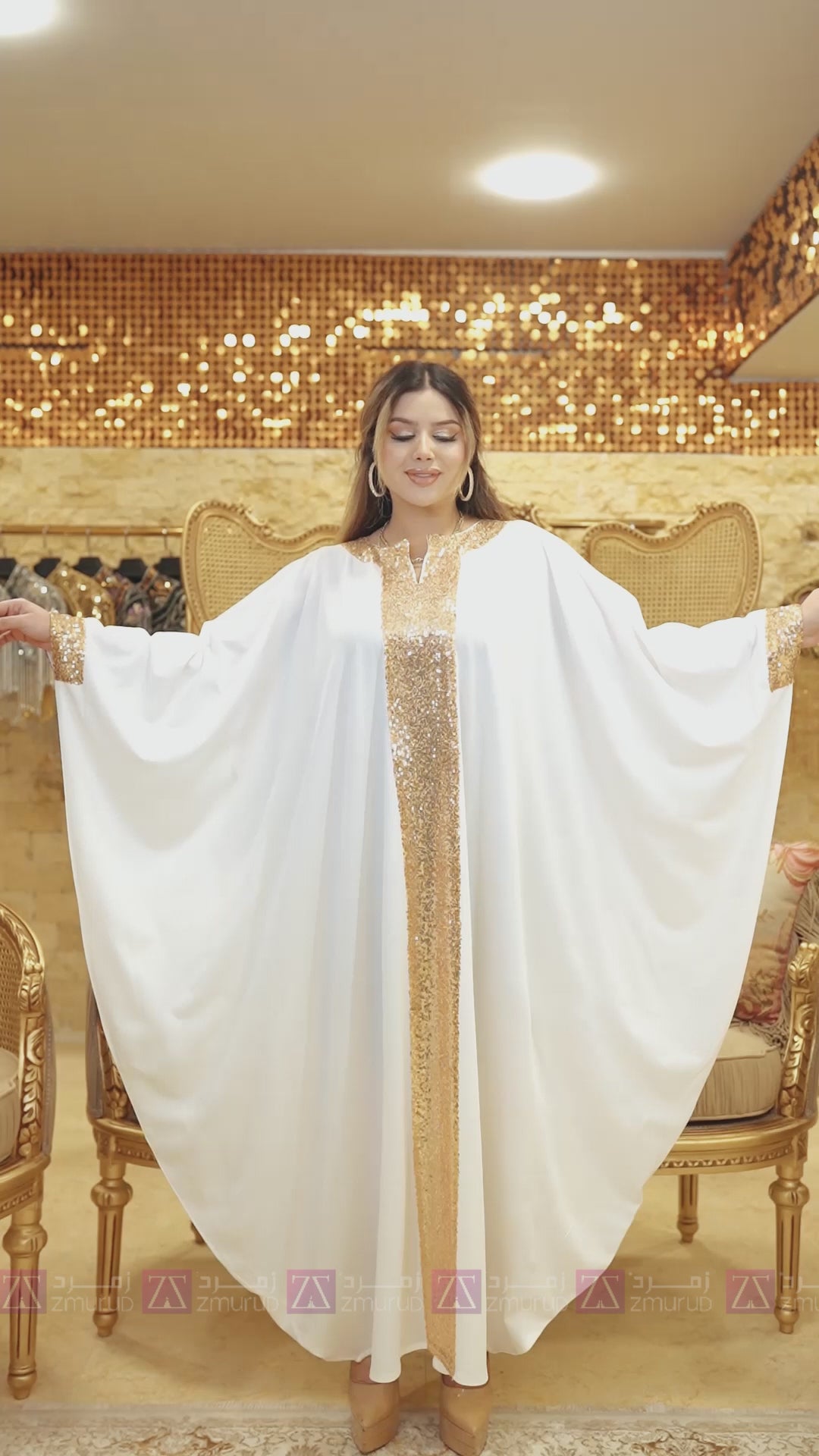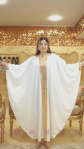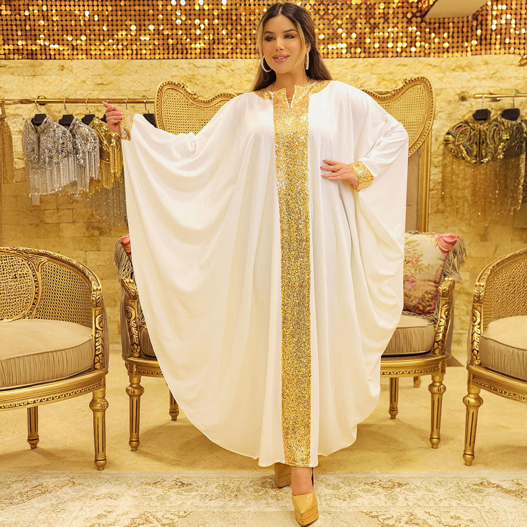 Jalabiya made of Lycra crepe with longitudinal sequin embroidery, free size, fits 70 kg to 130 kg, and length from shoulder 145 cm.