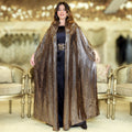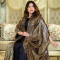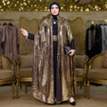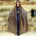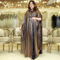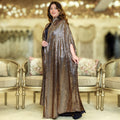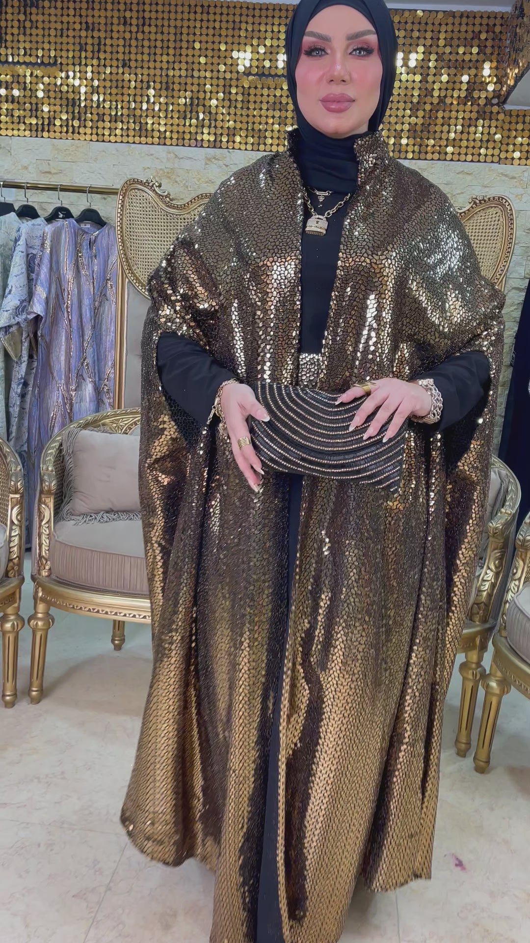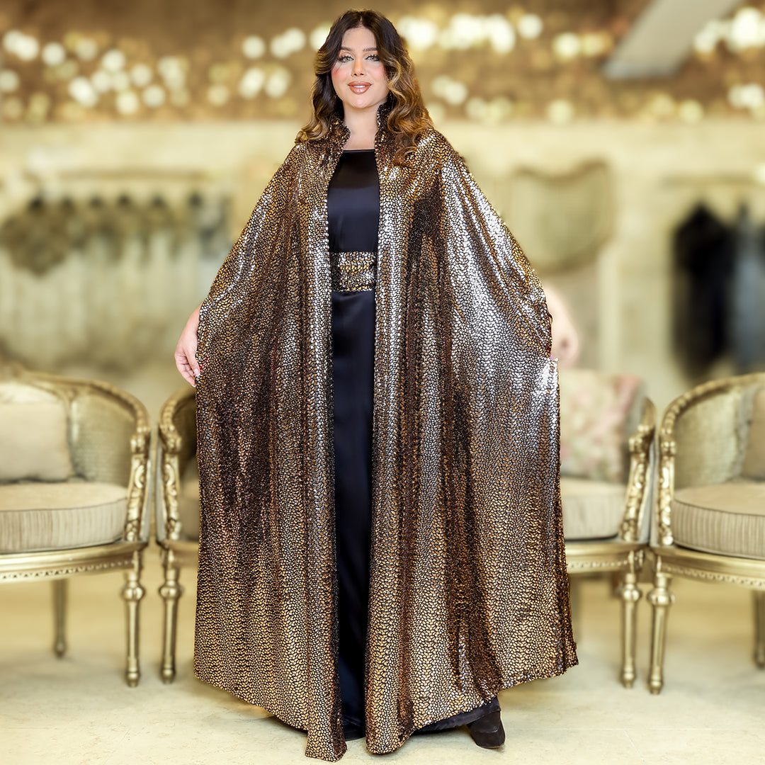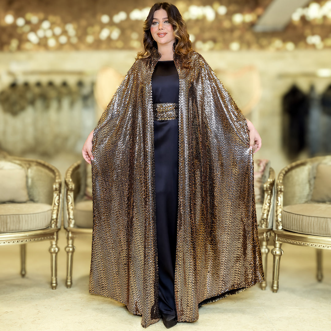 This elegant Soirée gown is adorned with shiny crystal embellishments, paired with a matching belt to highlight a central arabic design.
