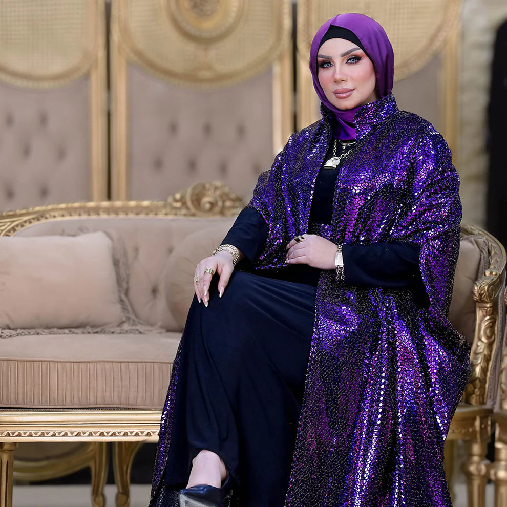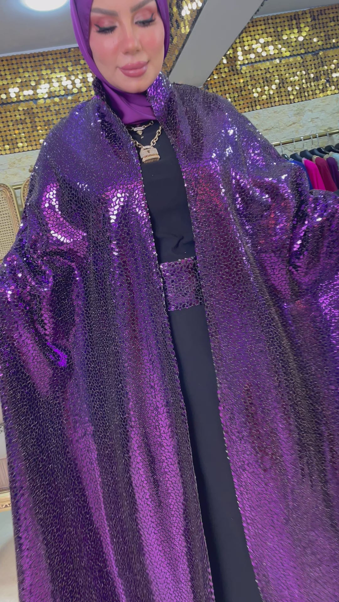 This elegant Soirée gown is adorned with shiny crystal embellishments, paired with a matching belt to highlight a central arabic design.