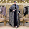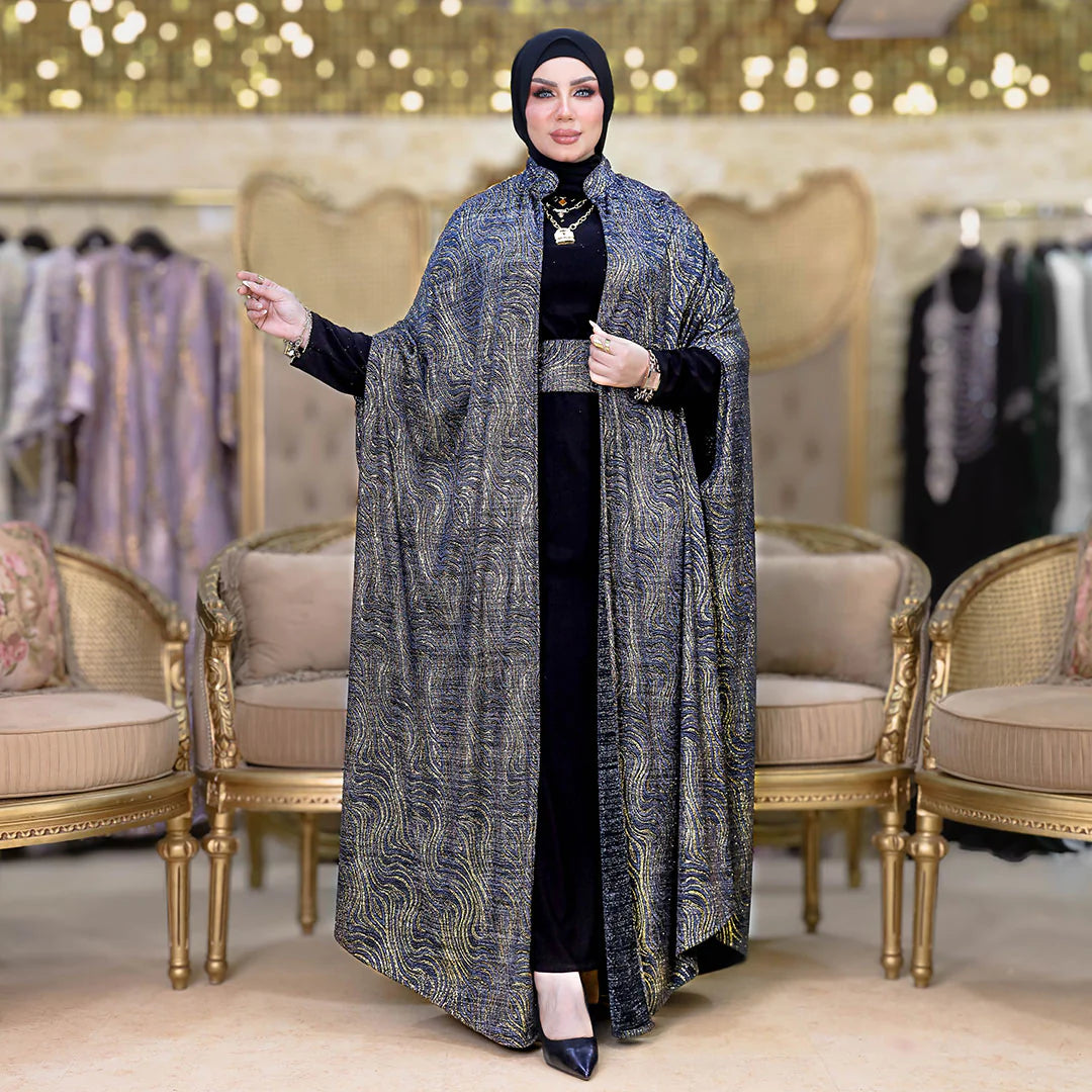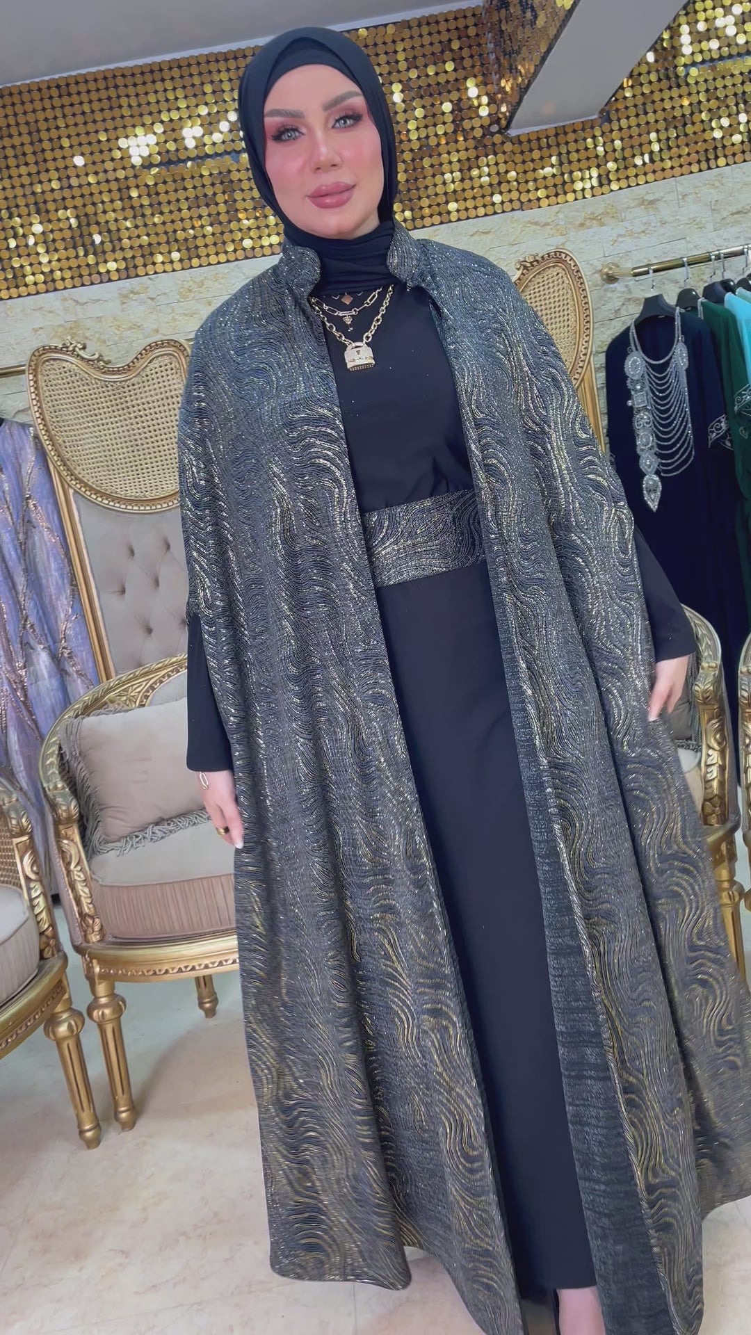 This elegant Soirée gown is adorned with shiny crystal embellishments, paired with a matching belt to highlight a central arabic design.