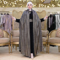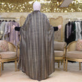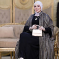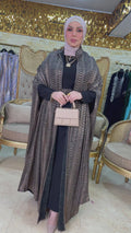 This elegant Soirée gown is adorned with shiny crystal embellishments, paired with a matching belt to highlight a central arabic design.