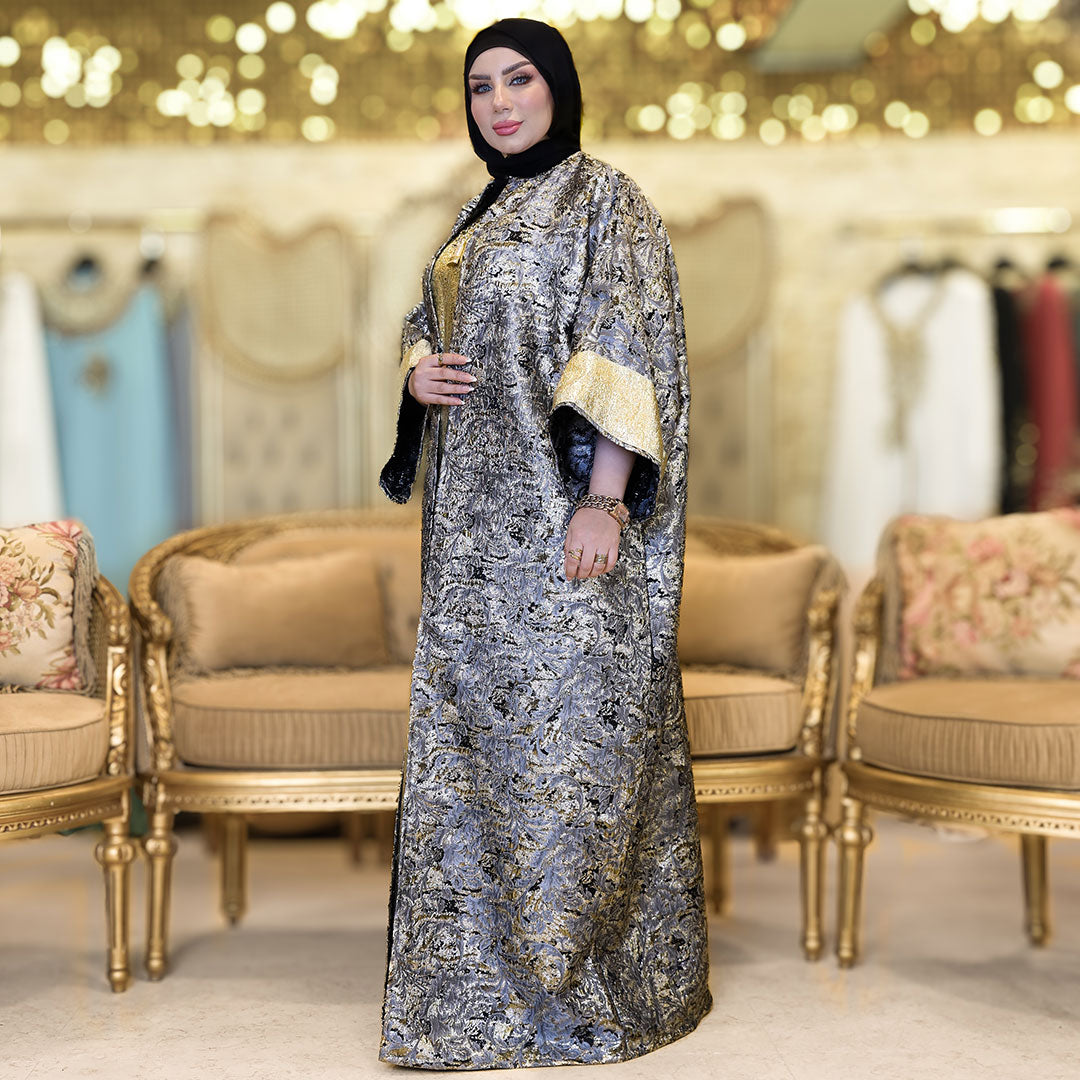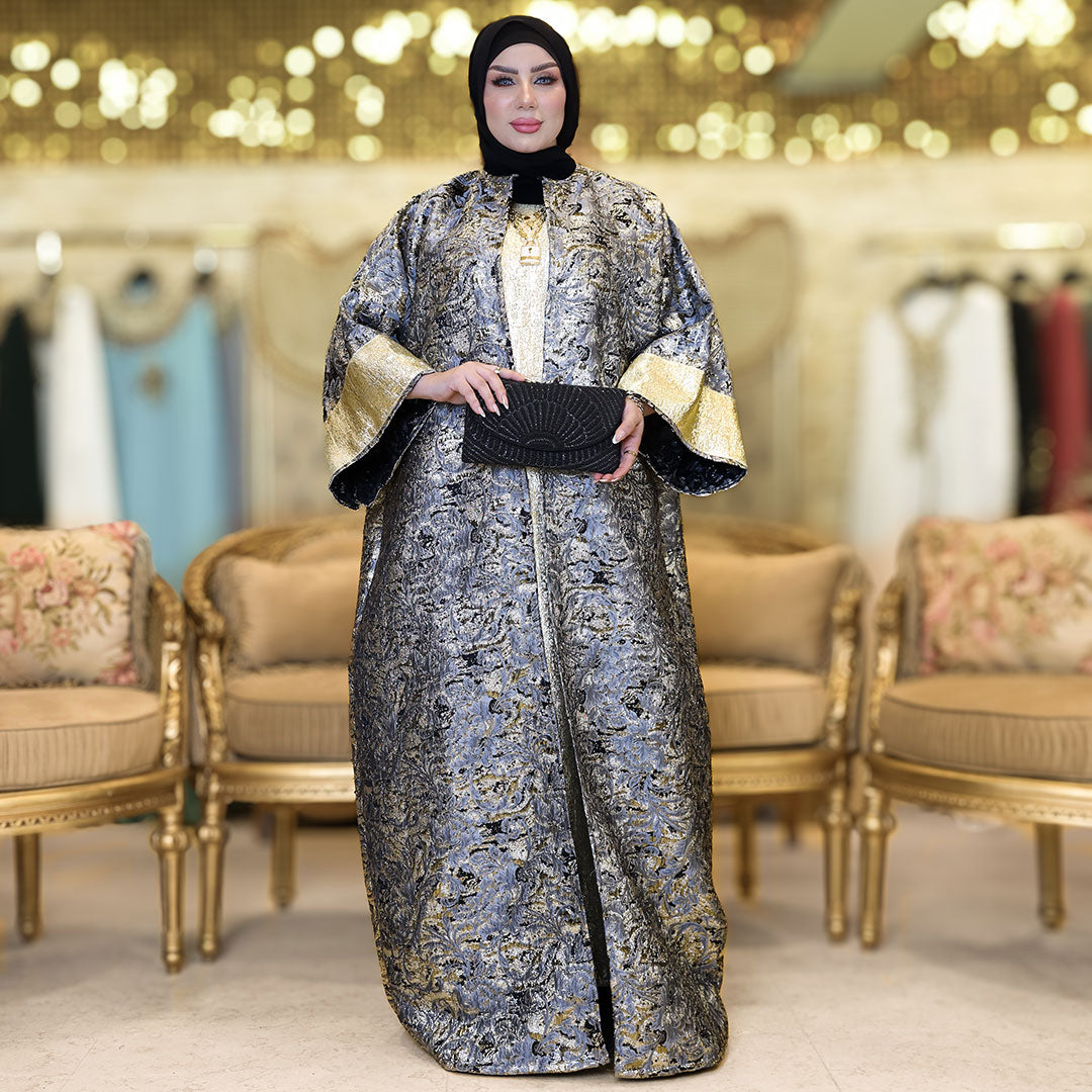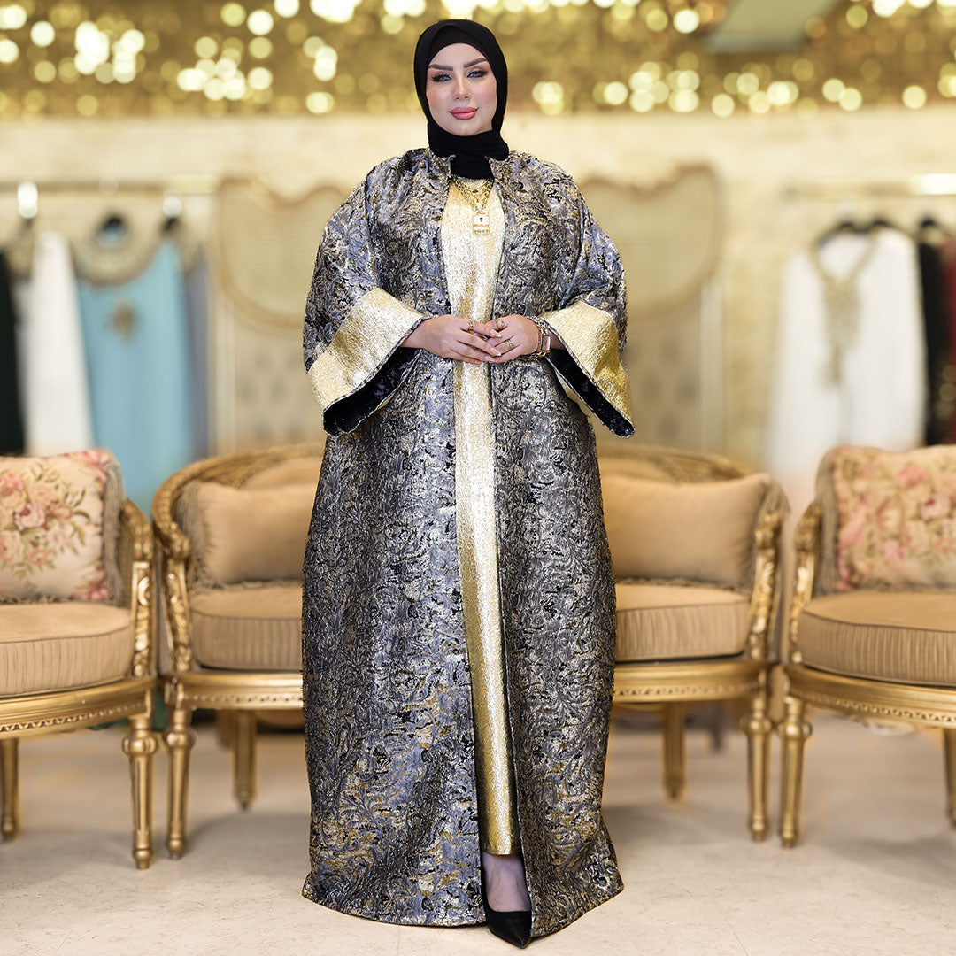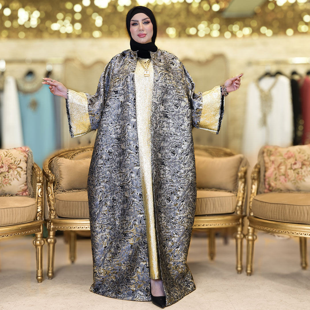 This elegant two-piece Brocade Bahraini Kaftan Set Shiny with basic gold brocade