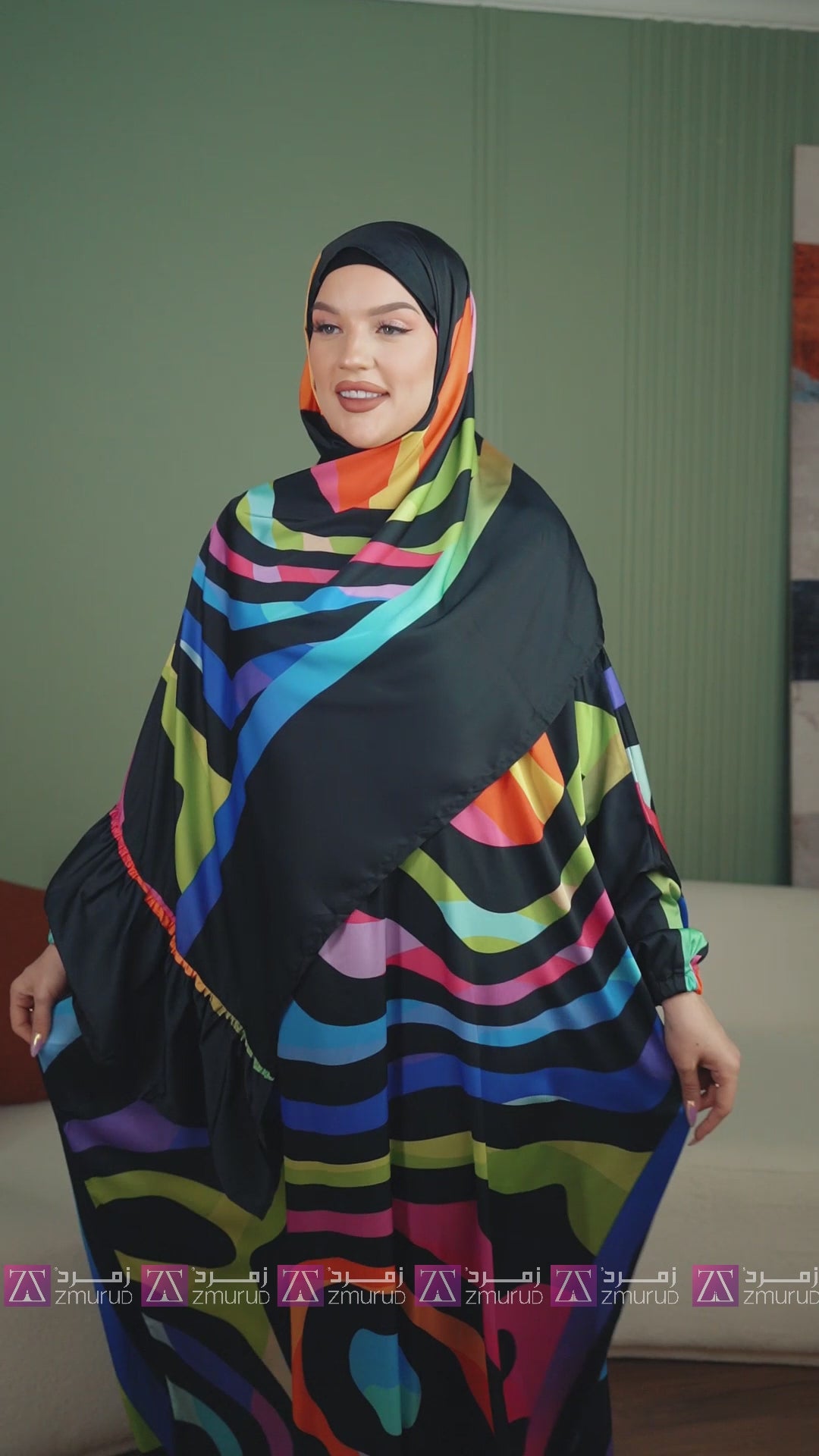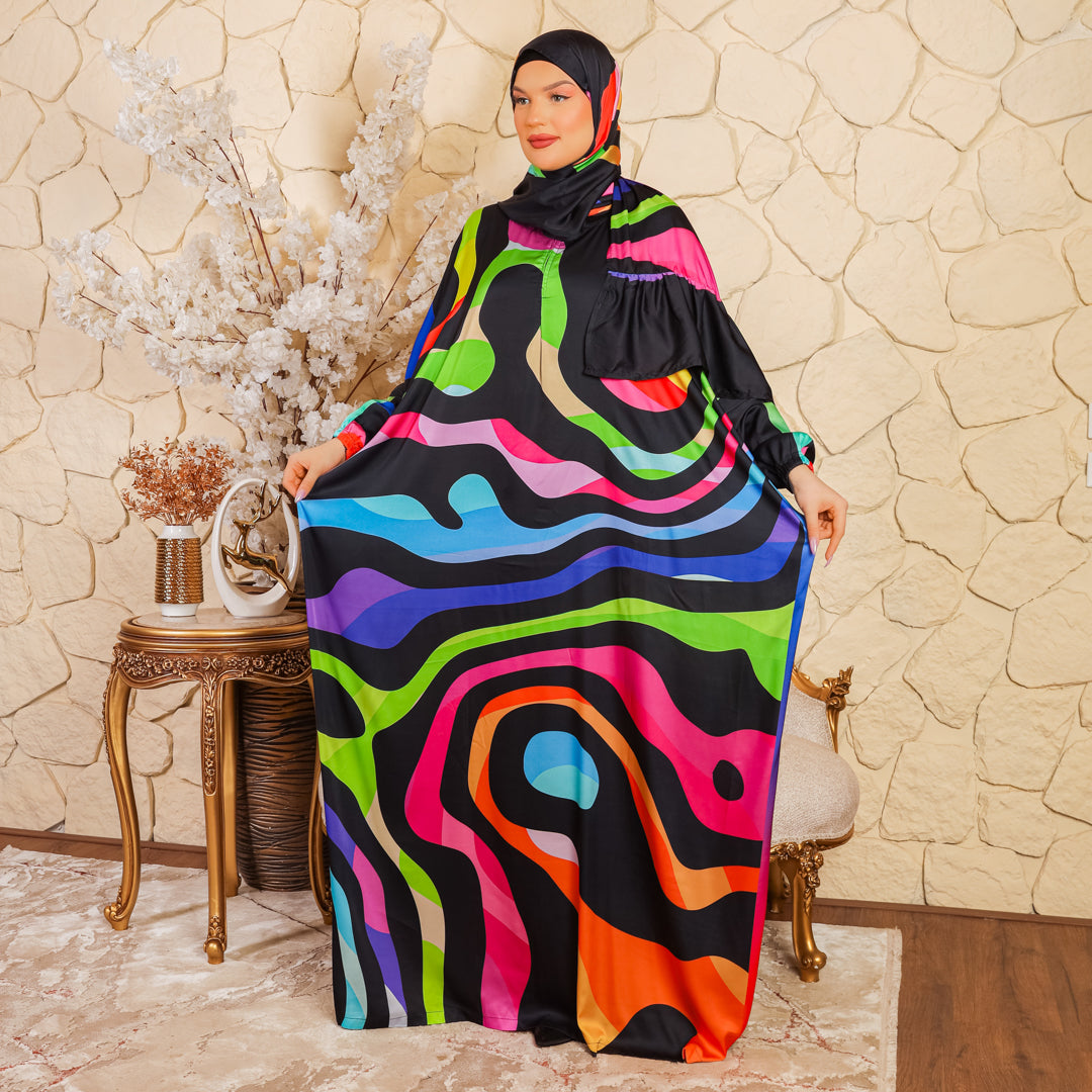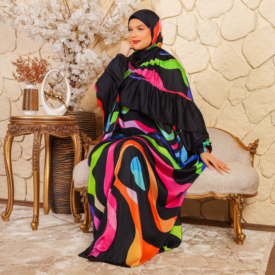 Practical Silky Satin prayer dress (Isdal) (digital print our own designs) Free Size fits 70kg to 90kg With a connected veil