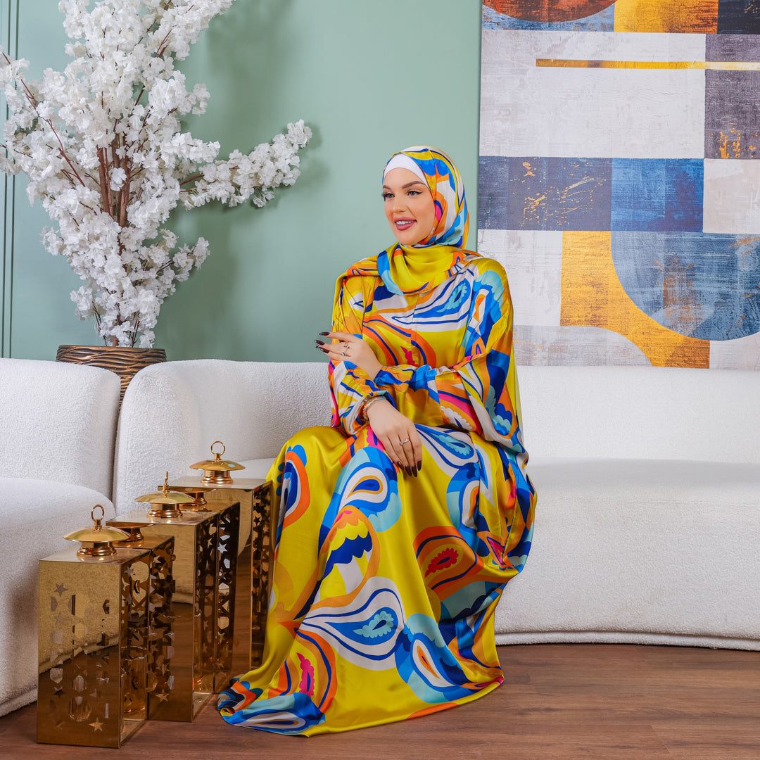 Practical Silky Satin prayer dress (Isdal) (digital print our own designs) Free Size fits 70kg to 130kg With a connected veil