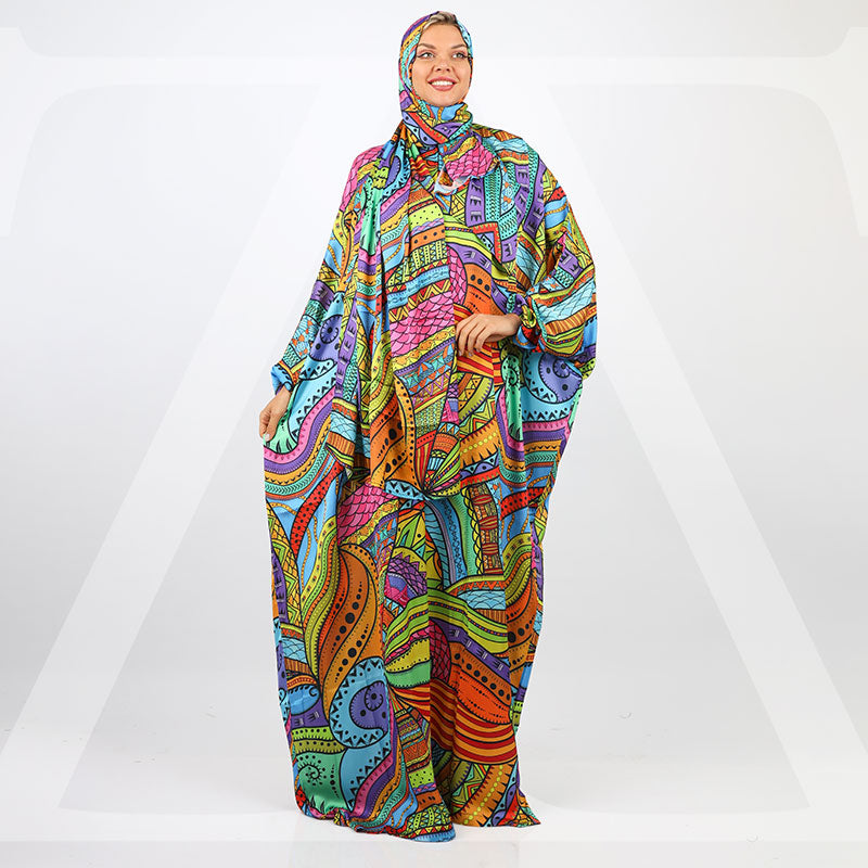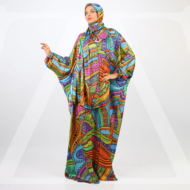 Practical Silky Satin prayer dress (Isdal) (digital print our own designs) Free Size fits 70kg to 130kg With a connected veil