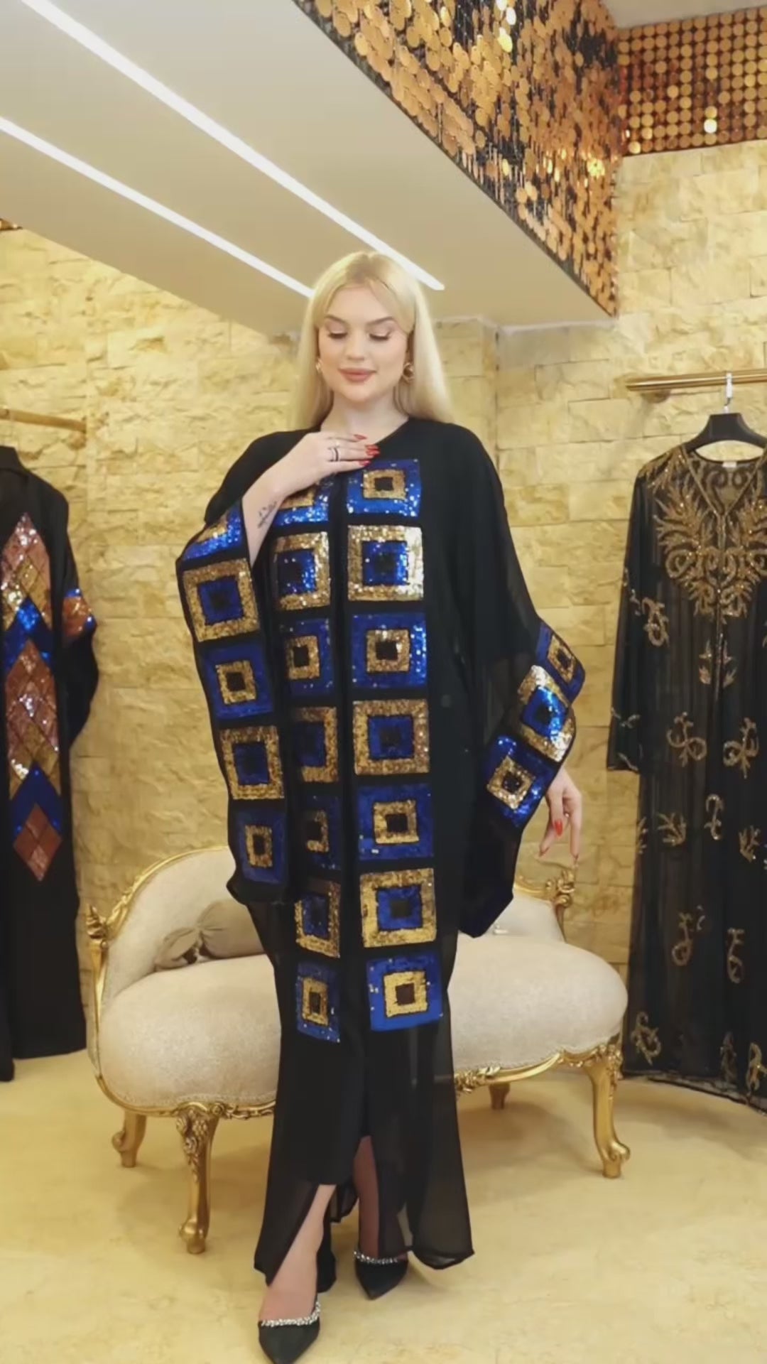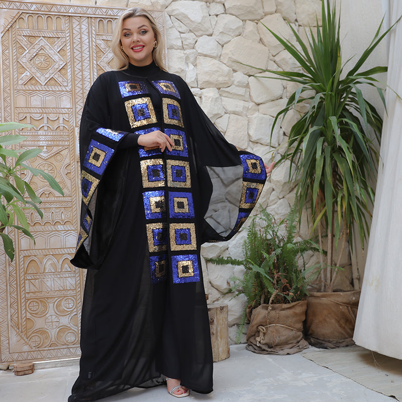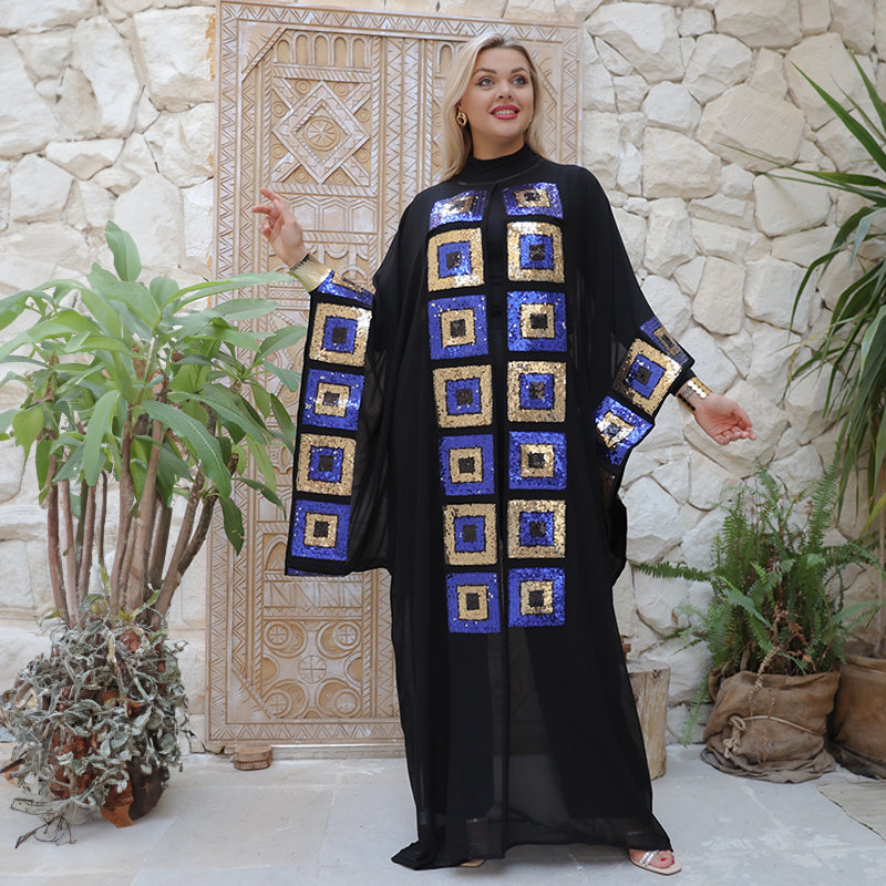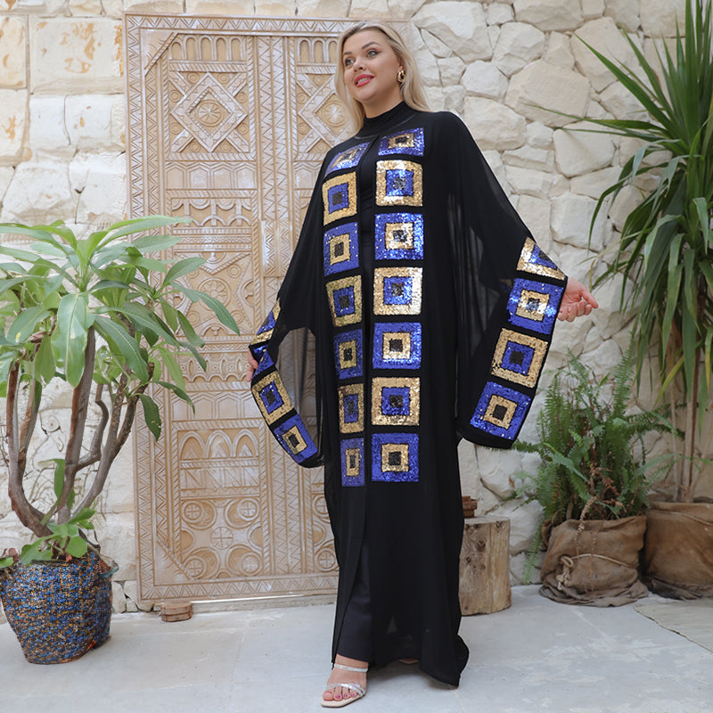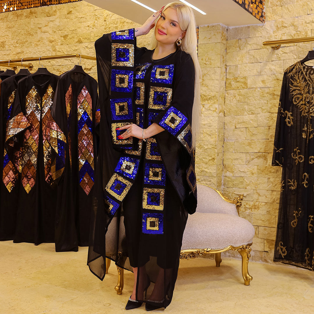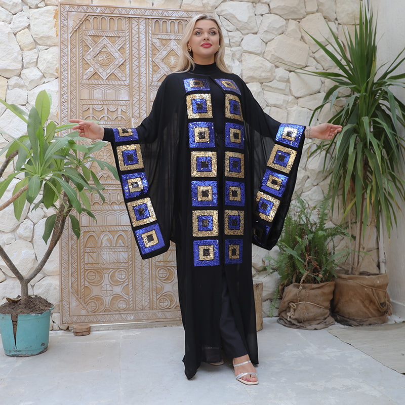 Transparent chiffon caftan without a Bahraini lining, modern embroidery Free size, fits 70 kg to 130 kg, and length from shoulder 155 cm.