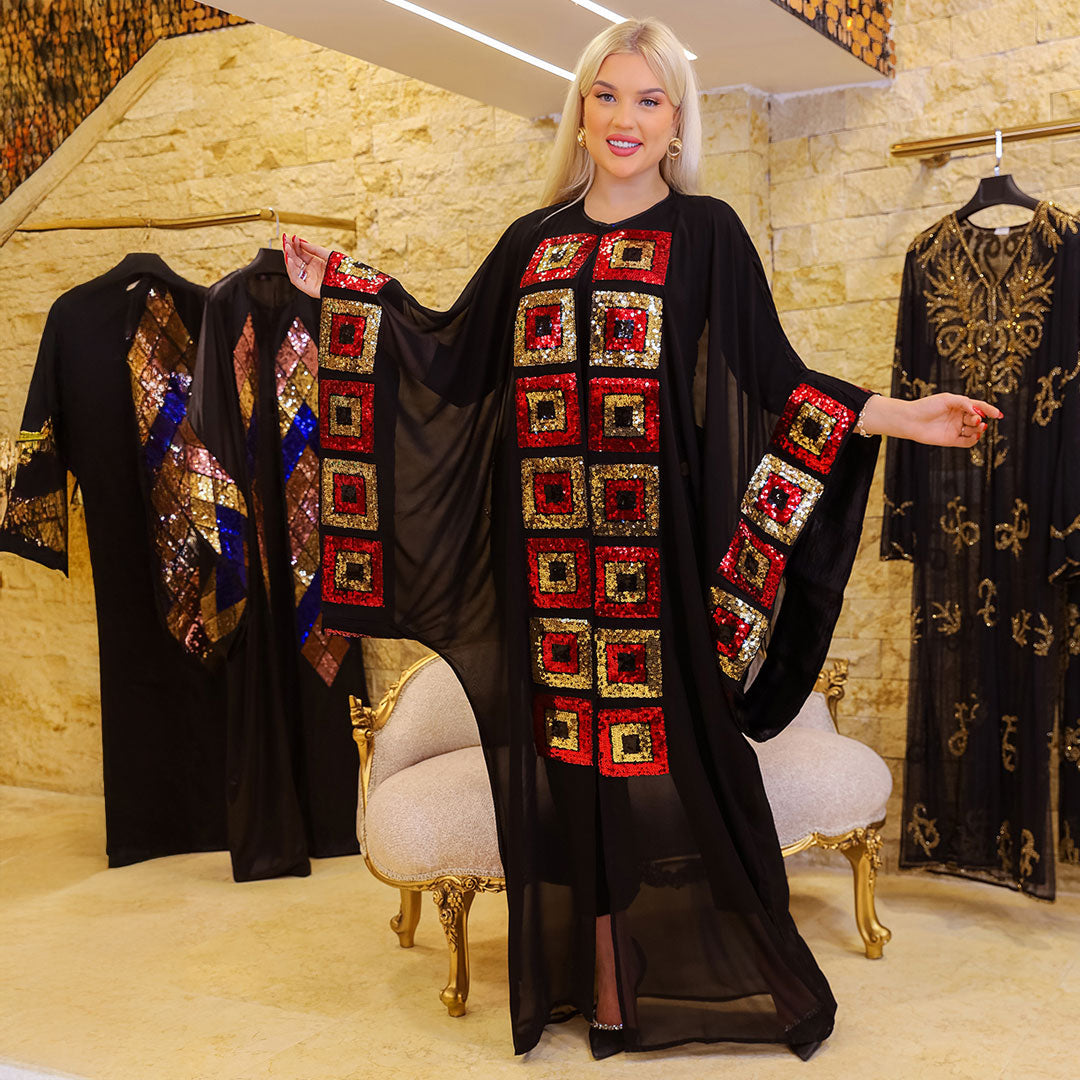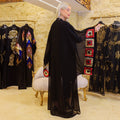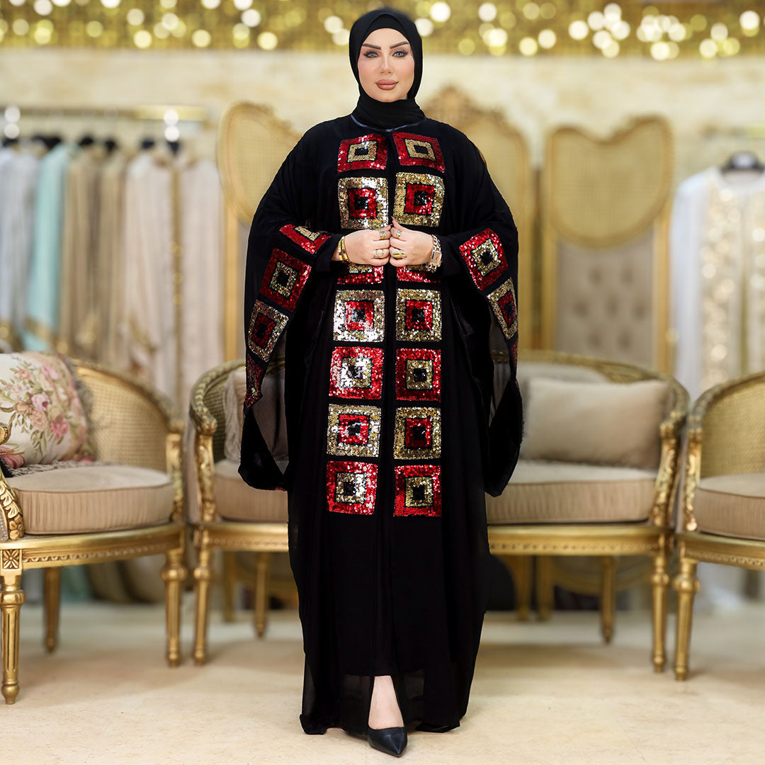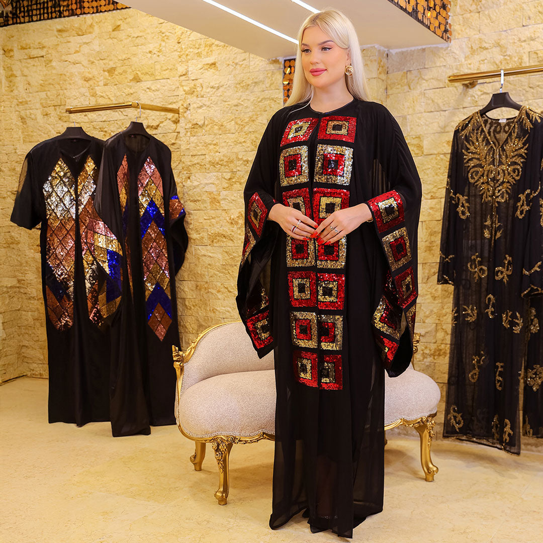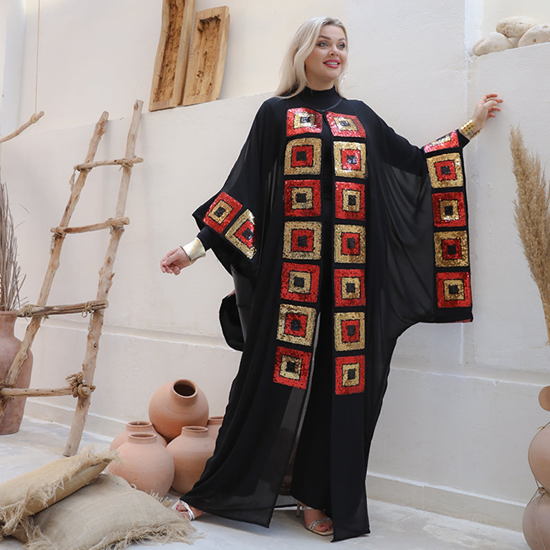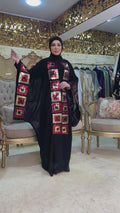 Transparent chiffon caftan without a Bahraini lining, modern embroidery Free size, fits 70 kg to 130 kg, and length from shoulder 155 cm.
