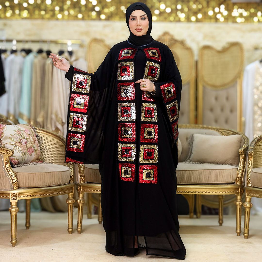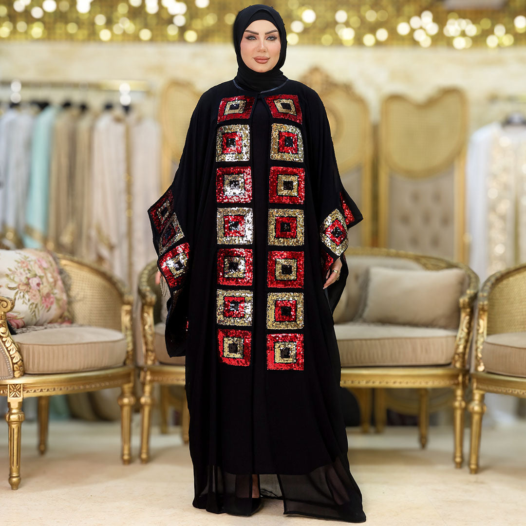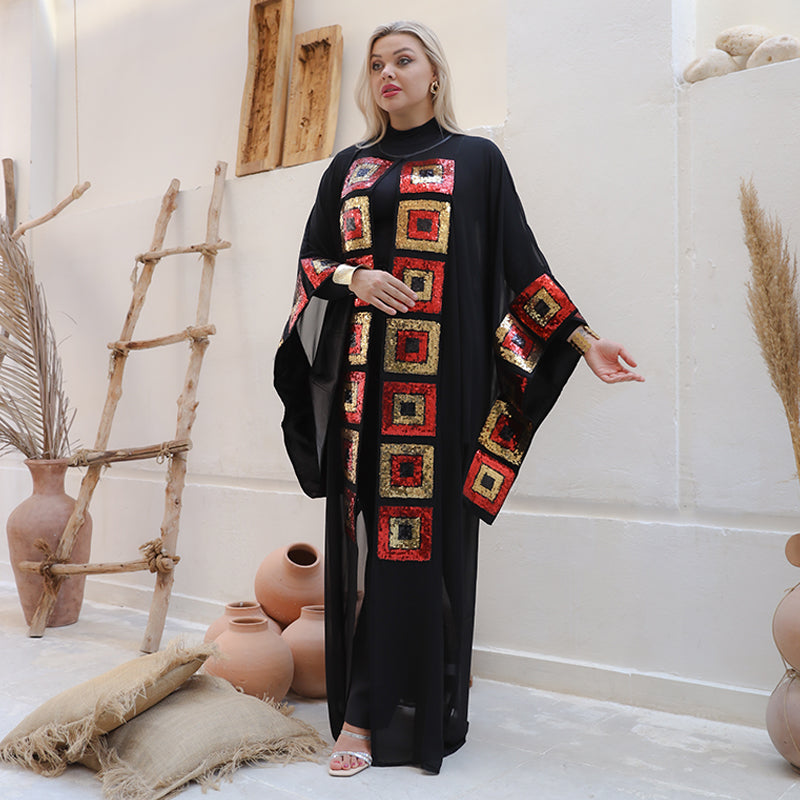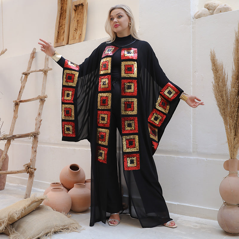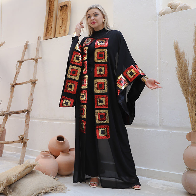 Transparent chiffon caftan without a Bahraini lining, modern embroidery Free size, fits 70 kg to 130 kg, and length from shoulder 155 cm.