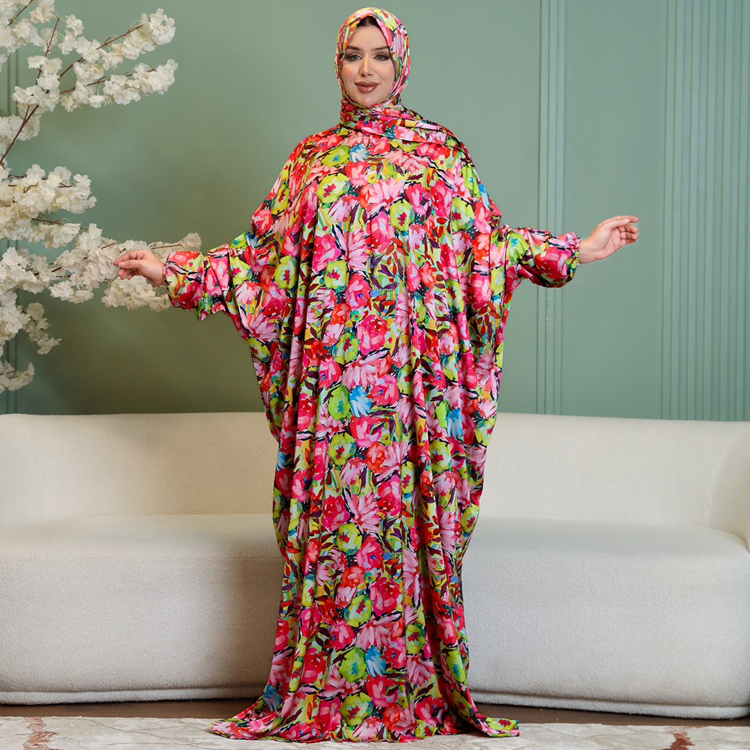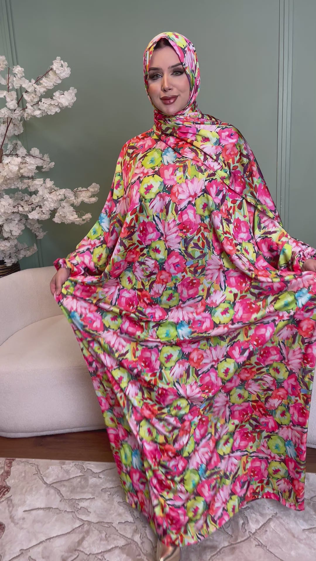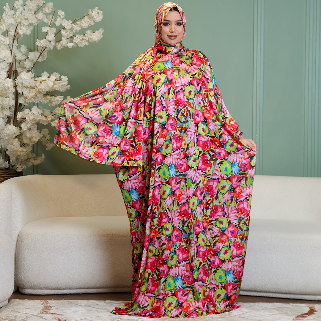 Practical Silky Satin prayer dress (Isdal) (digital print our own designs) Free Size fits 70kg to 130kg With a connected veil