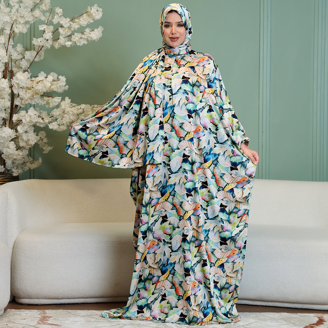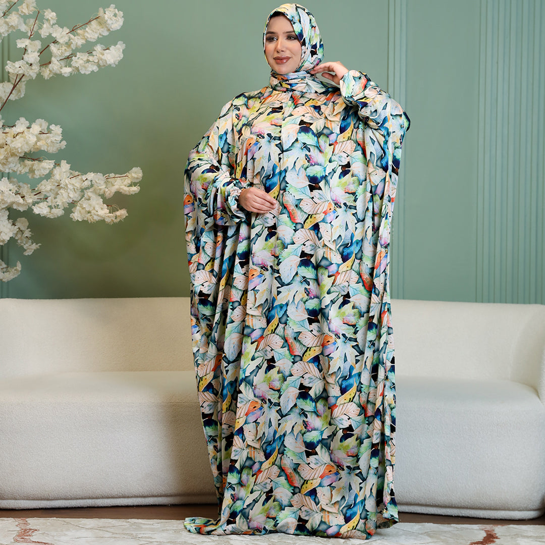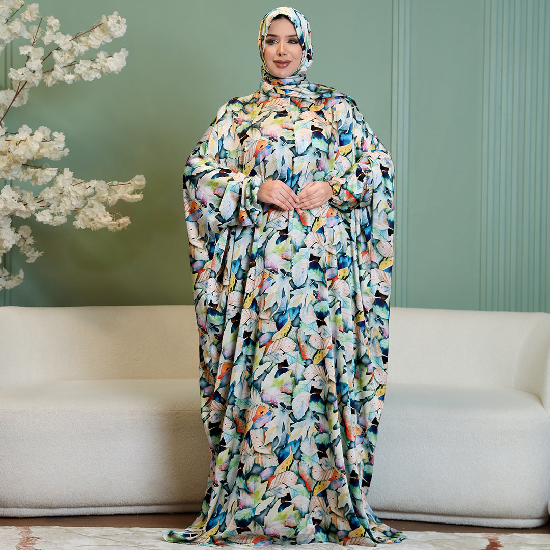 Practical Silky Satin prayer dress (Isdal) (digital print our own designs) Free Size fits 70kg to 130kg With a connected veil