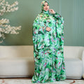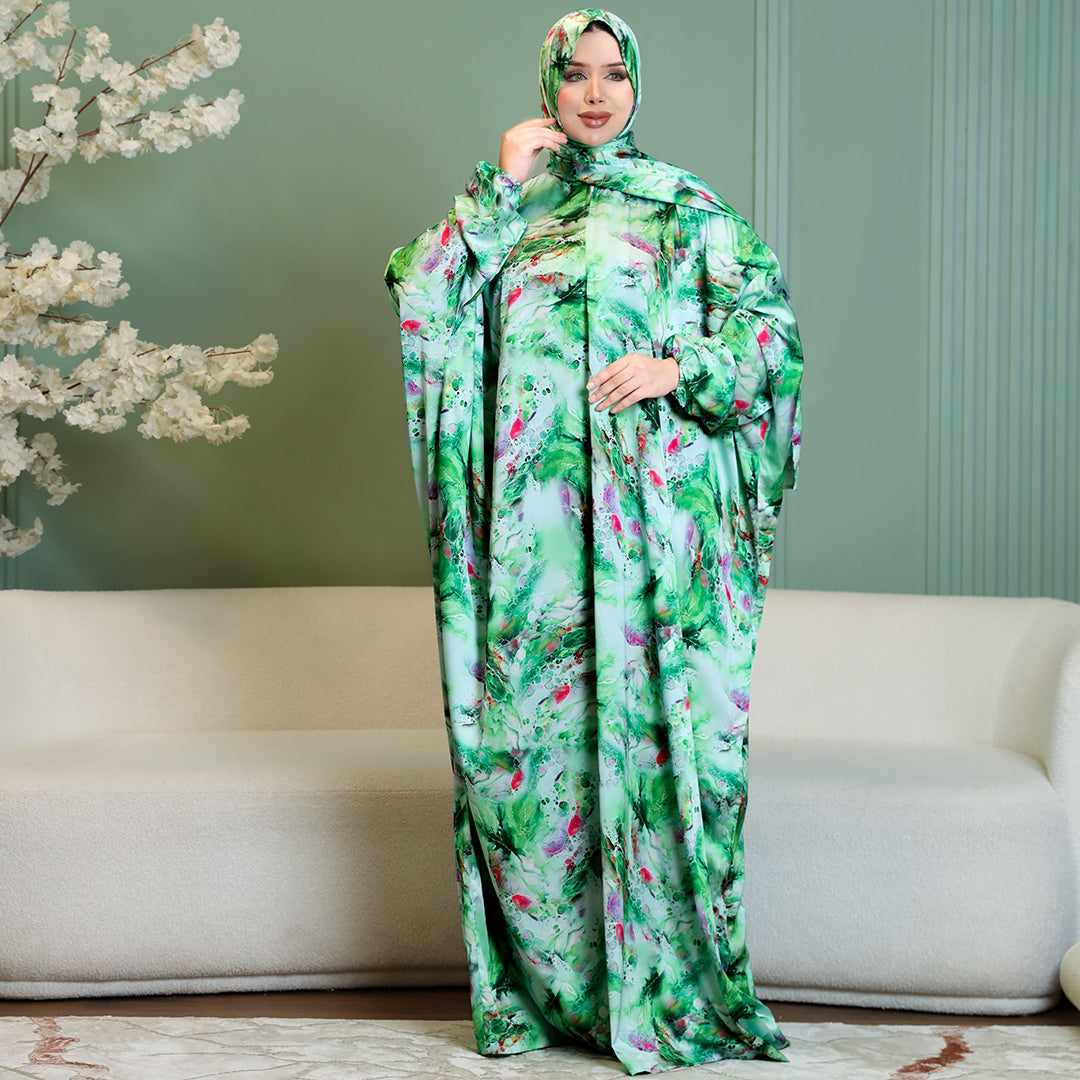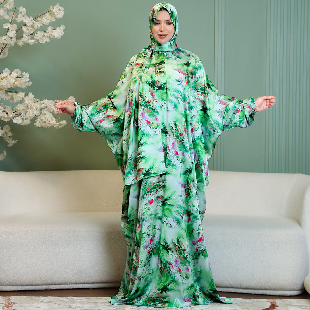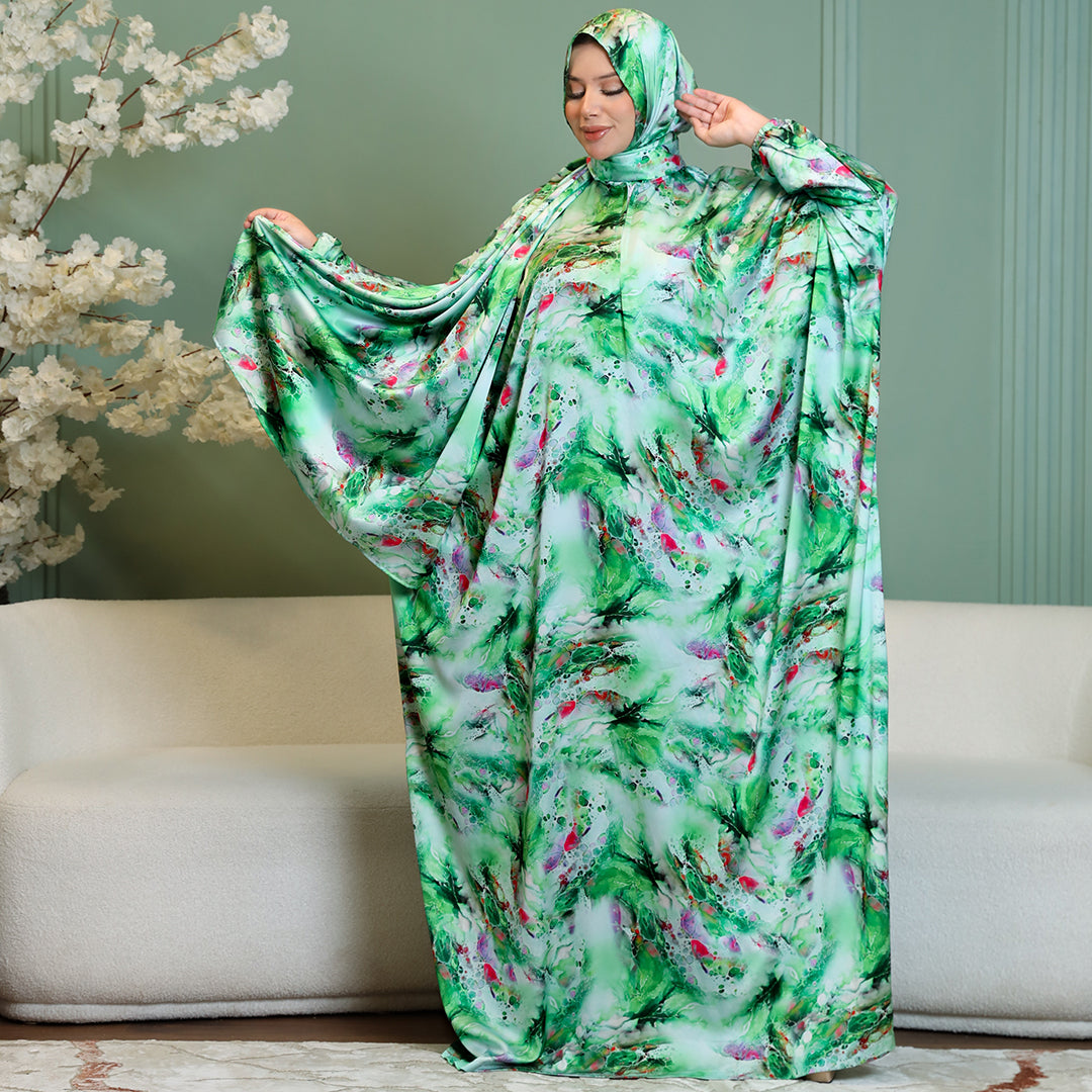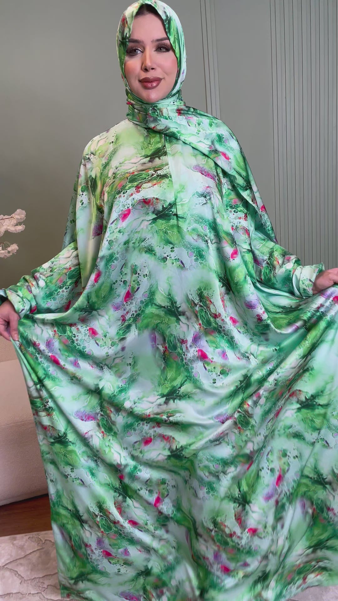 Practical Silky Satin prayer dress (Isdal) (digital print our own designs) Free Size fits 70kg to 130kg With a connected veil
