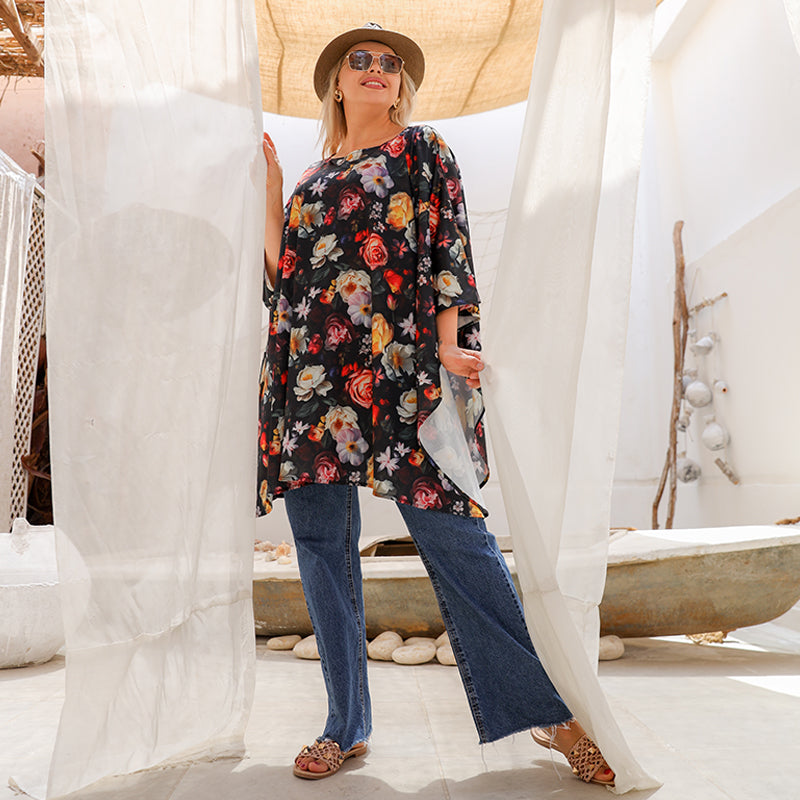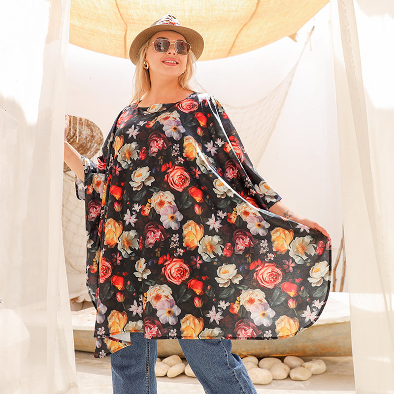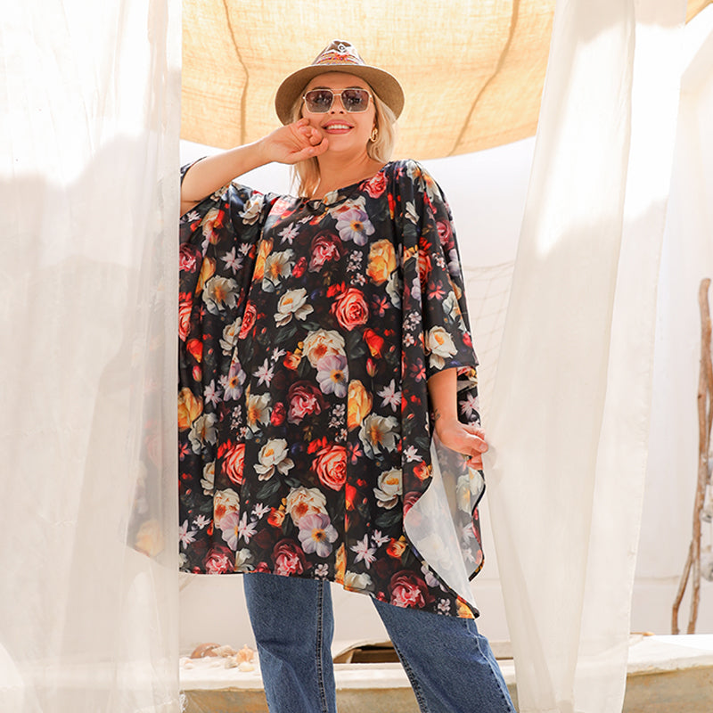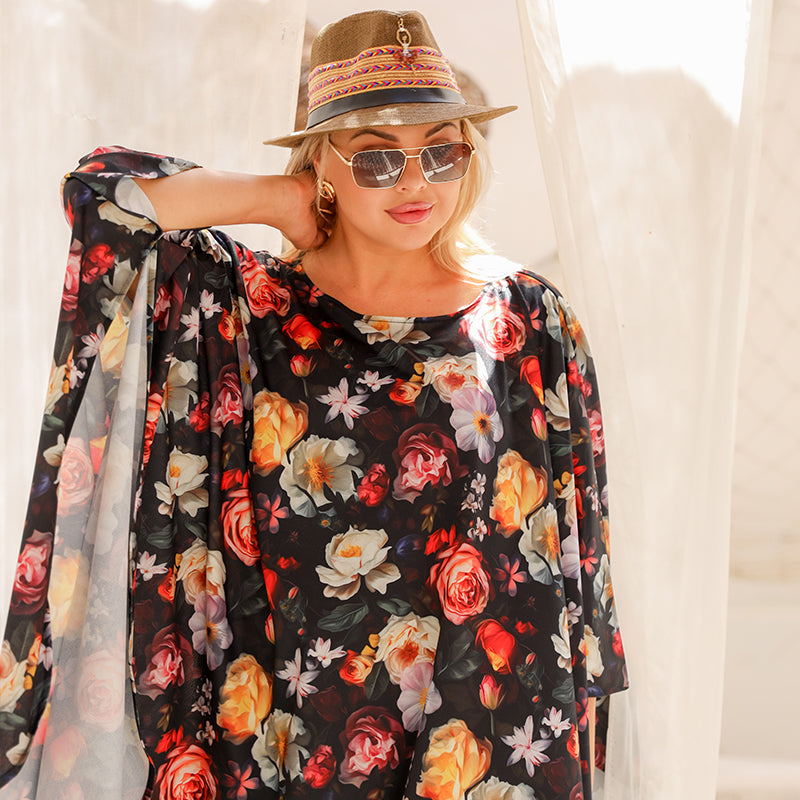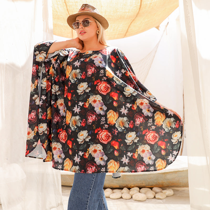 printed autumn jersey poncho with modern designs, free size, fits from 70 kg to 130 kg, and the length from the shoulder is 90 cm.