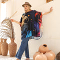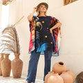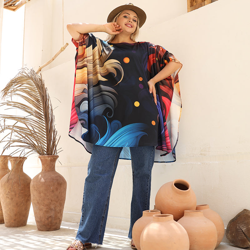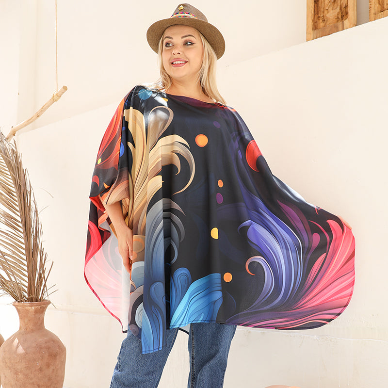 printed autumn jersey poncho with modern designs, free size, fits from 70 kg to 130 kg, and the length from the shoulder is 90 cm.