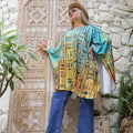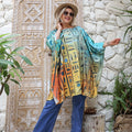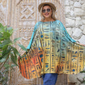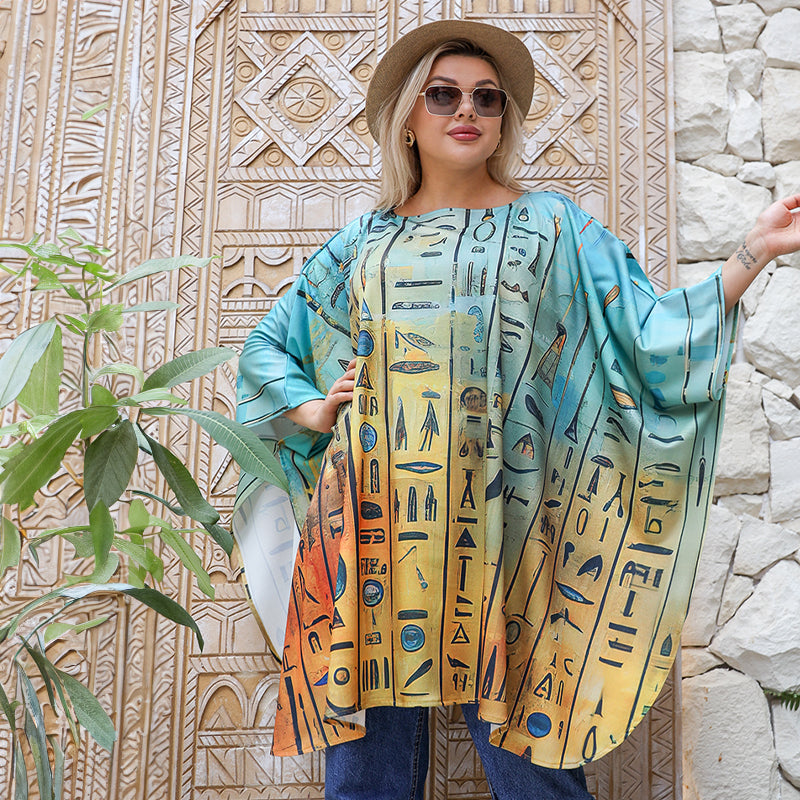 printed autumn jersey poncho with modern designs, free size, fits from 70 kg to 130 kg, and the length from the shoulder is 90 cm.