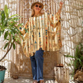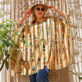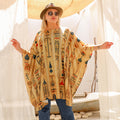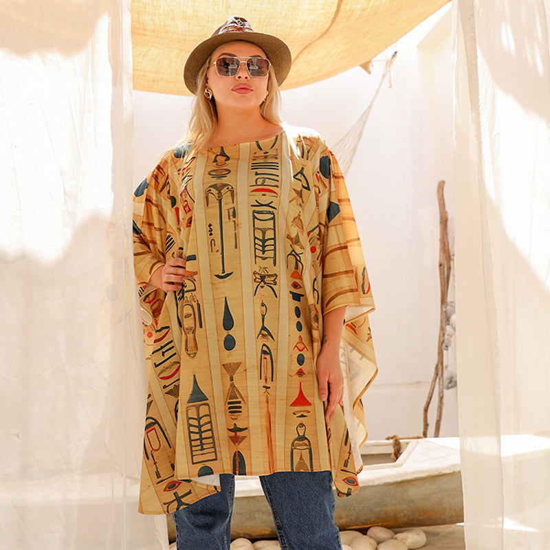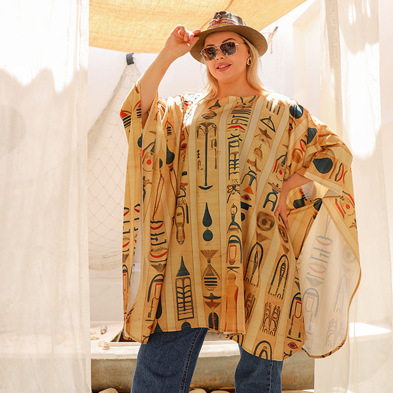 printed autumn jersey poncho with modern designs, free size, fits from 70 kg to 130 kg, and the length from the shoulder is 90 cm.