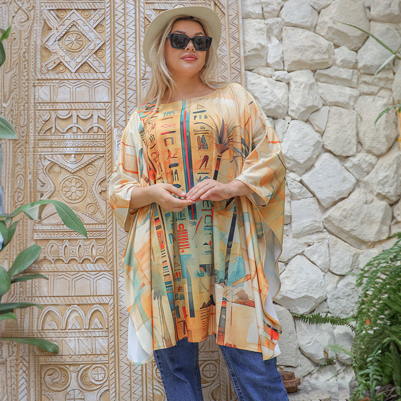 printed autumn jersey poncho with modern designs, free size, fits from 70 kg to 130 kg, and the length from the shoulder is 90 cm.