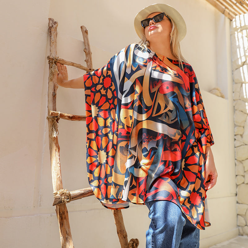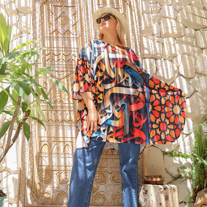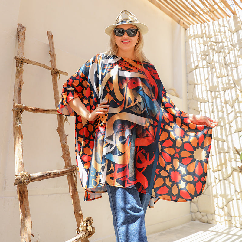 printed autumn jersey poncho with modern designs, free size, fits from 70 kg to 130 kg, and the length from the shoulder is 90 cm.