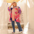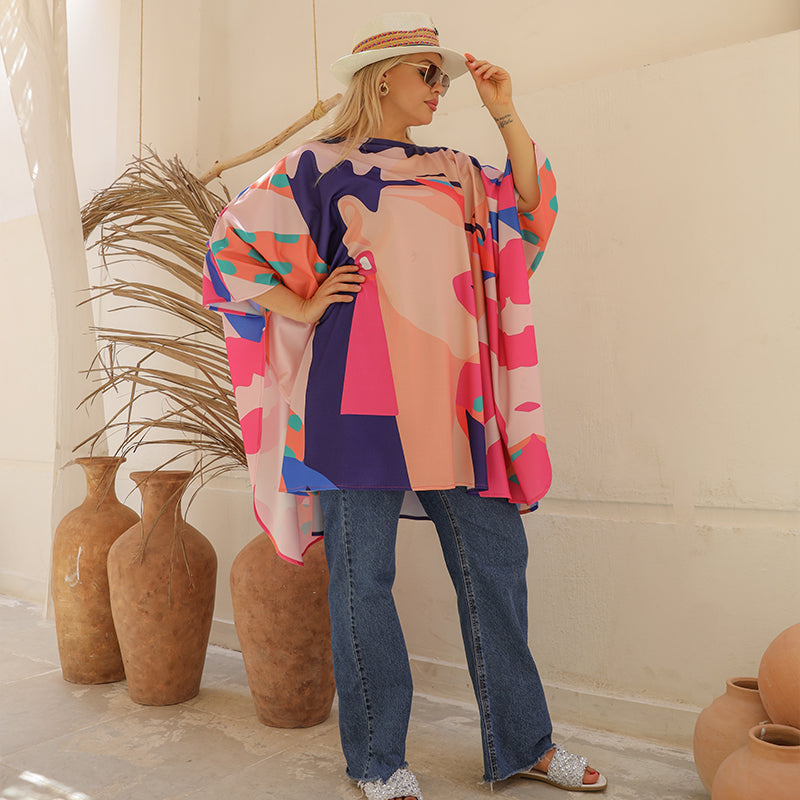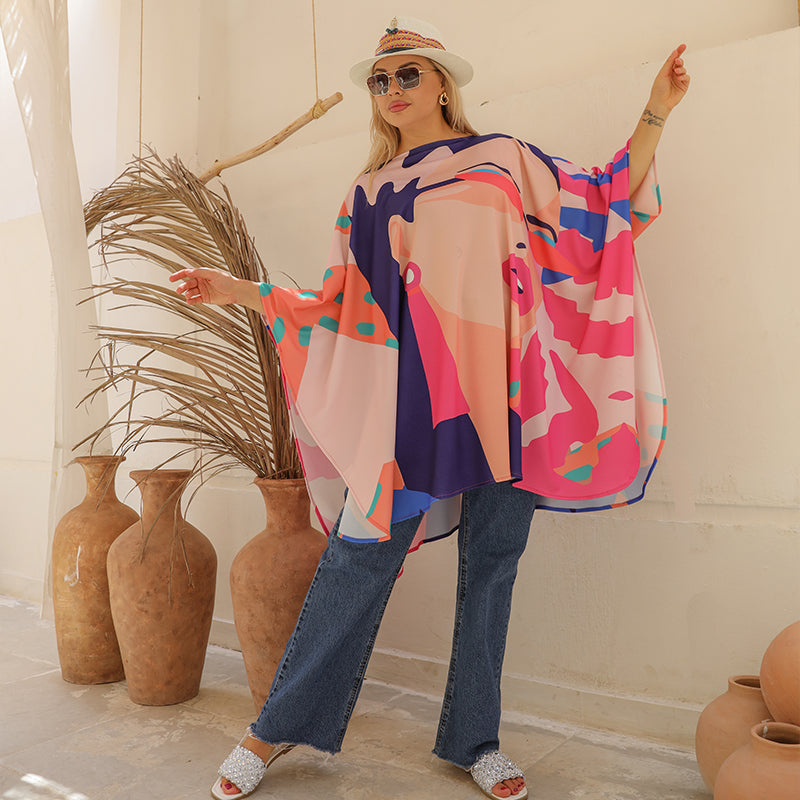 printed autumn jersey poncho with modern designs, free size, fits from 70 kg to 130 kg, and the length from the shoulder is 90 cm.