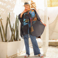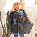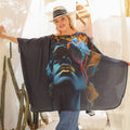printed autumn jersey poncho with modern designs, free size, fits from 70 kg to 130 kg, and the length from the shoulder is 90 cm.