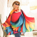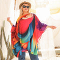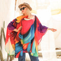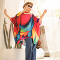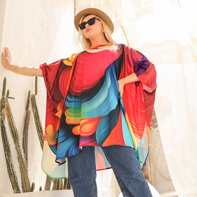 printed autumn jersey poncho with modern designs, free size, fits from 70 kg to 130 kg, and the length from the shoulder is 90 cm.