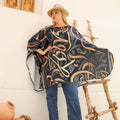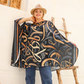printed autumn jersey poncho with modern designs, free size, fits from 70 kg to 130 kg, and the length from the shoulder is 90 cm.