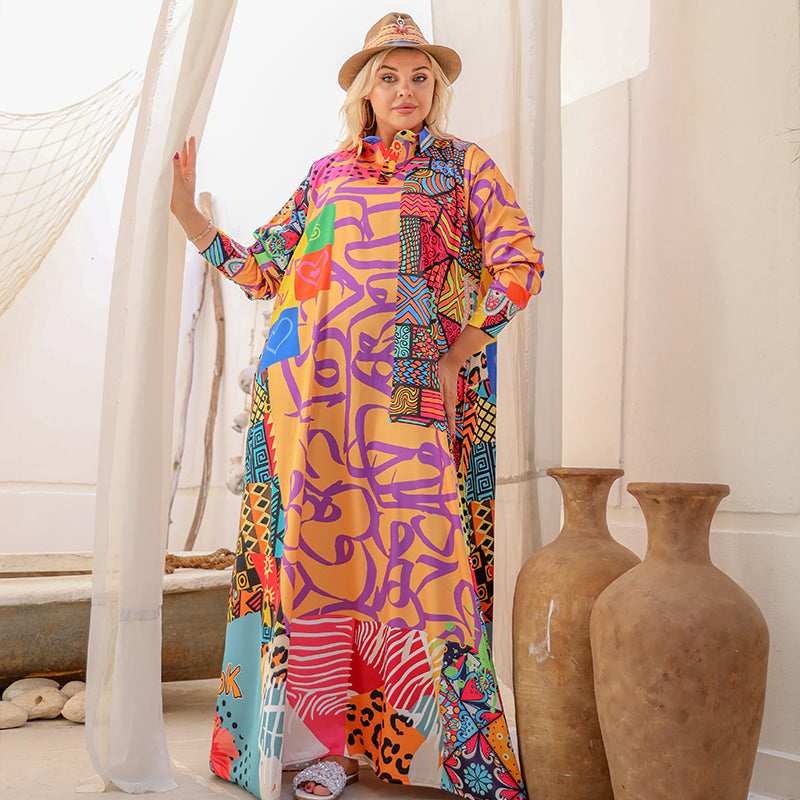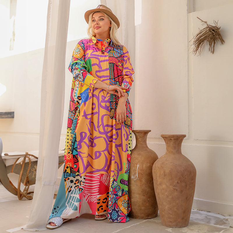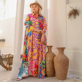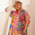 Silky Satin dress ( Armani) dress with digital print sleeves from our own designs. Free size, fits 70 kg to 90 kg and length from shoulder 140 cm.