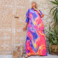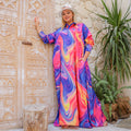 Silky Satin dress ( Armani) dress with digital print sleeves from our own designs. Free size, fits 70 kg to 90 kg and length from shoulder 140 cm.