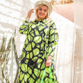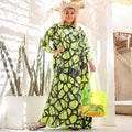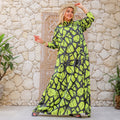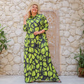 Silky Satin dress ( Armani) dress with digital print sleeves from our own designs. Free size, fits 70 kg to 90 kg and length from shoulder 140 cm.