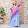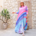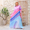 Silky Satin dress ( Armani) dress with digital print sleeves from our own designs. Free size, fits 70 kg to 90 kg and length from shoulder 140 cm.